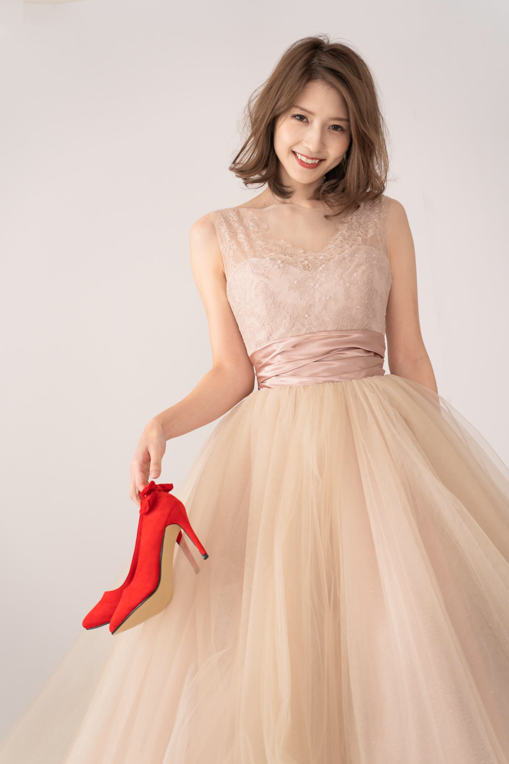 人気のくすみ系カラードレス。 柔らかなベージュカラーのチュールにスモーキーピンクのバックリボンが大人可愛いこの時期にオススメドレス。 よくあるビスチェタイプではなくデコルテが隠れるヨークが可愛い♪♪
